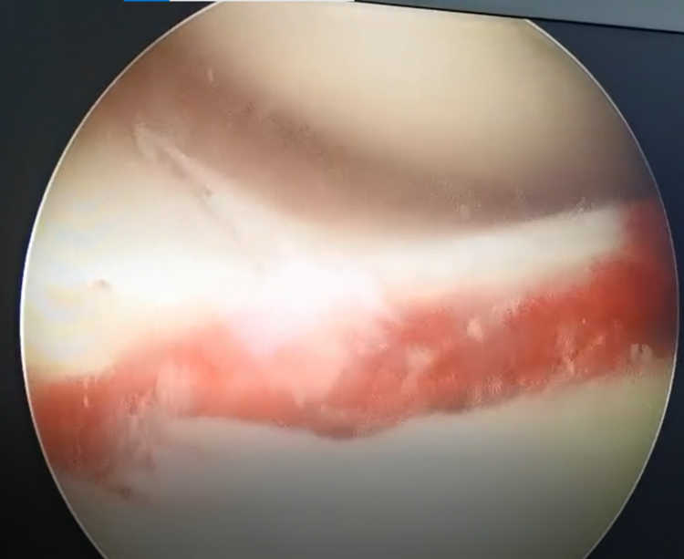 镜下探查见,ACL胫骨止点撕脱骨折,边缘伴少量血痂,内侧胫骨平台骨折,关节面软骨劈裂,无塌陷。