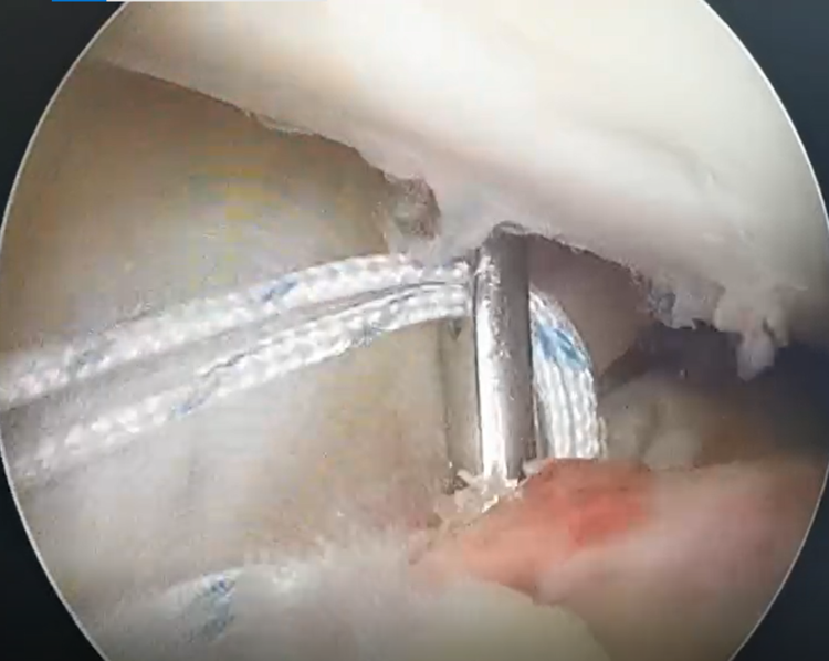 前抽屉状态下,肩关节外排钉于胫骨骨道挤压固定缝线。