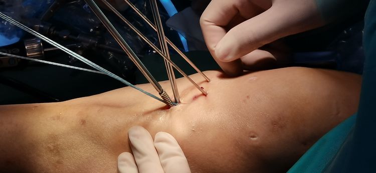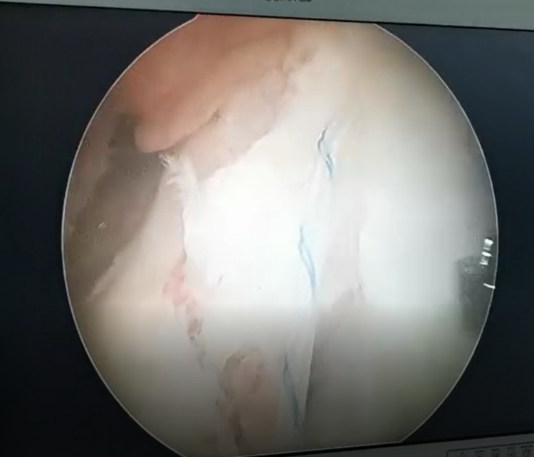 关节镜下,PDS-Ⅱ缝线牵引高强度缝线编织缝合ACL。